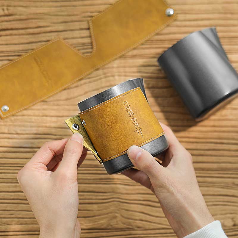 Das gesamte Milchkännchen ist aus Edelstahl (SUS304) gefertigt und es hat einen Lederbezug. Edelstahl leitet Wärme besonders gut, daher eignet sich dieses Kännchen perfekt zum Milchschäumen, da man die Temperatur der Milch beim Erhitzen gut fühlen kann. Außerdem ist Edelstahl sehr robust, langlebig und leicht zu reinigen.